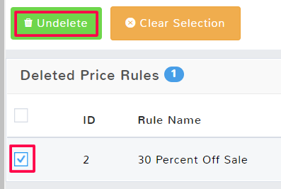 Check the box next to the Price Rule that you want to recover, and then hit Undelete in the top menu. The Price Rule will now appear on the Price Rule main feature page.