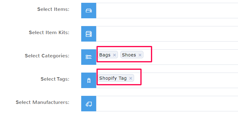 You have the option of selecting Items, Item Kits, Categories, Tags, and Manufacturers to apply your price rules to. All of the fields work the same.