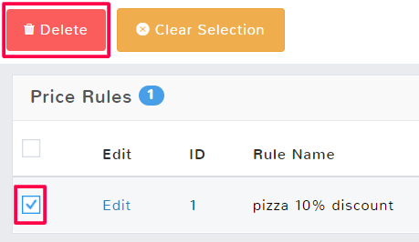 Click the check box next to the price rule that you wish to delete, and then select Delete in the top bar. You can select multiple rules at once by checking more boxes.