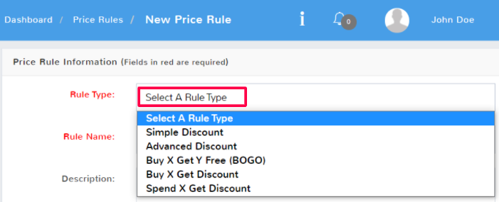 There are several Rule Types that you can select for price rules, which one will depend on the kind of discount you are trying to make.