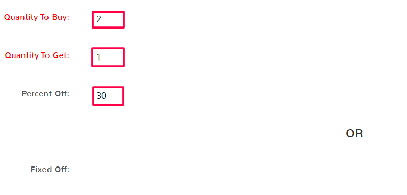 This Rule Type lets you select how many of an item a customer must purchase in order to get a discount on more of them. The Quantity to Buy is the number of an item the customer has to purchase in one sale to get a discount on the Quantity to Get of the same item in a sale. You can choose a Percent Off discount for the customer’s total, or enter a Fixed Off discount.