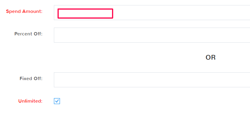For example, a Spend Amount of  $100 with a Percent off of 10% would make the customer’s total $90. The same Spend Amount with a Fixed Off of $15 dollars would leave the customer total at $85.